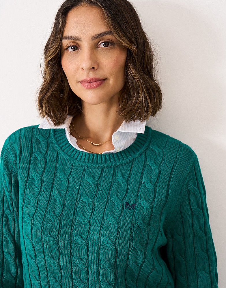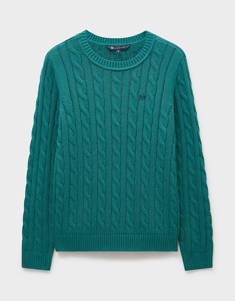 This classic Heritage Jumper from Crew comes in a chunky, twisted cable knit that is crafted in a luxurious cotton and cashmere blend. The Shaded Spruce colour is a deep jade green that looks great throughout autumn when paired with jeans. Ribbed hems and Crew branding on the chest add the final touches to this go-to knit.