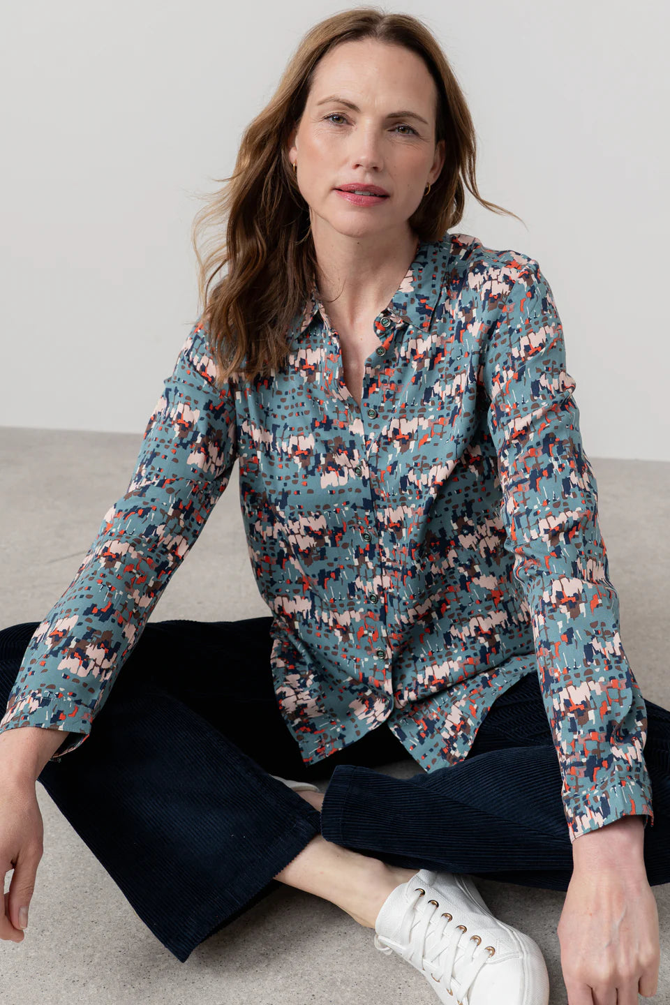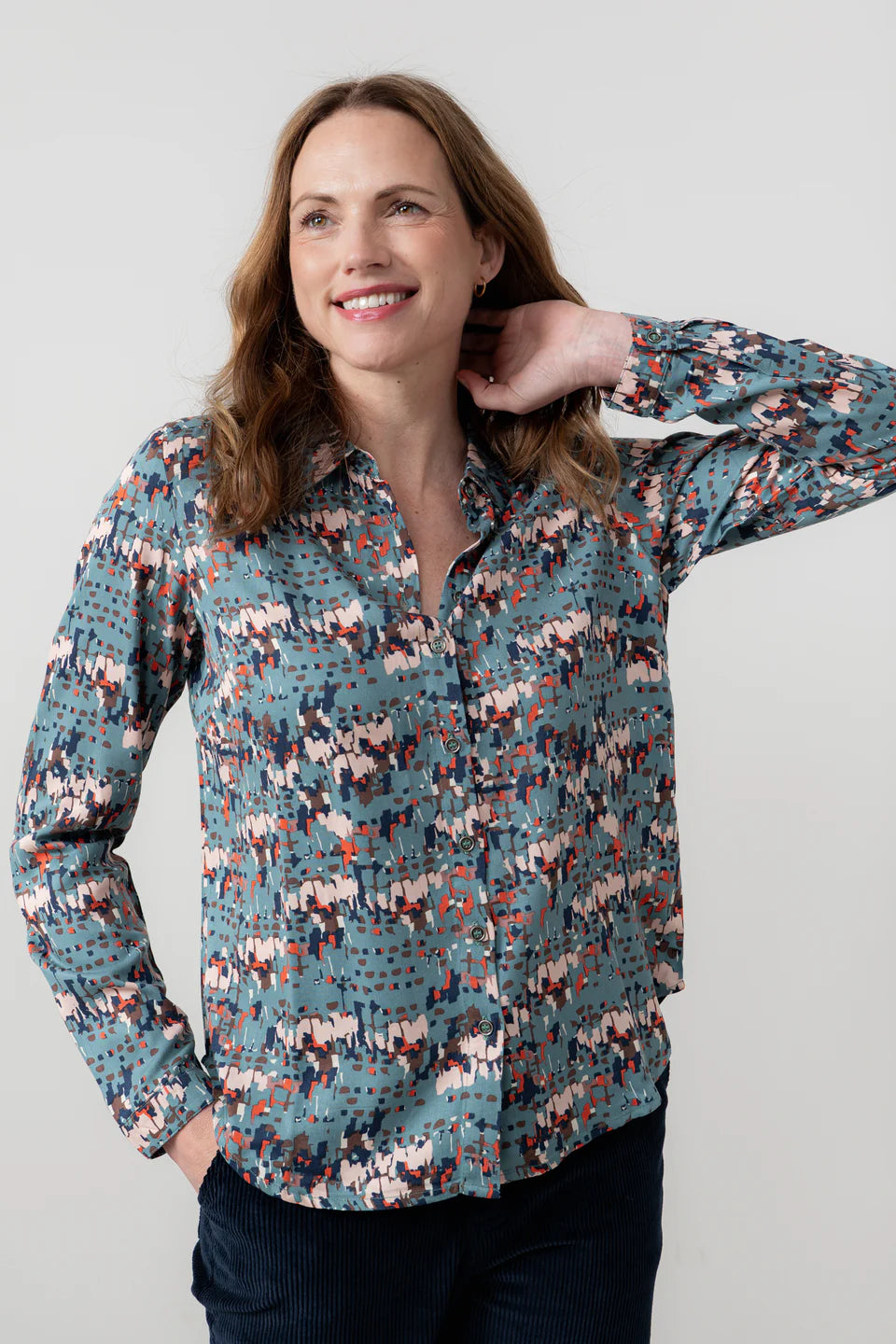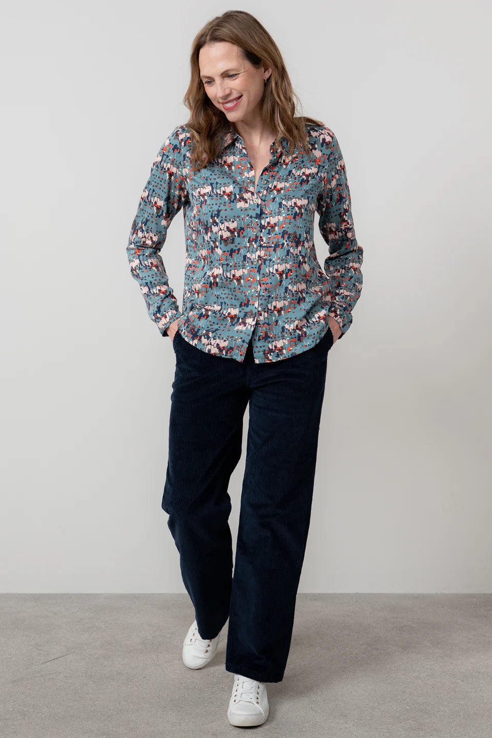 Lily & Me's Patsy Shirt is classic in style and pretty in print! Featuring their bespoke geometric Clover design in a lovely Sea Mist palette, this shirt is perfect for pairing with plain trousers or jeans,. It's super handy for layering under a jumper or knitted tank, and the woven fabric drapes beautifully with an inverted pleat at the back yoke.