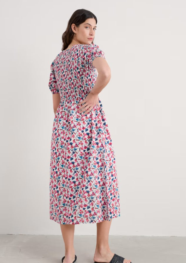 This summer dress from Sea Salt combines the best of both worlds - elegance and ease. The smocked bodice provides a flattering fit while the above-the-ankle skirt adds a touch of sophistication. Plus, the elasticated cuffs on the short sleeves give them just the right amount of volume. Perfect for any summer occasion.