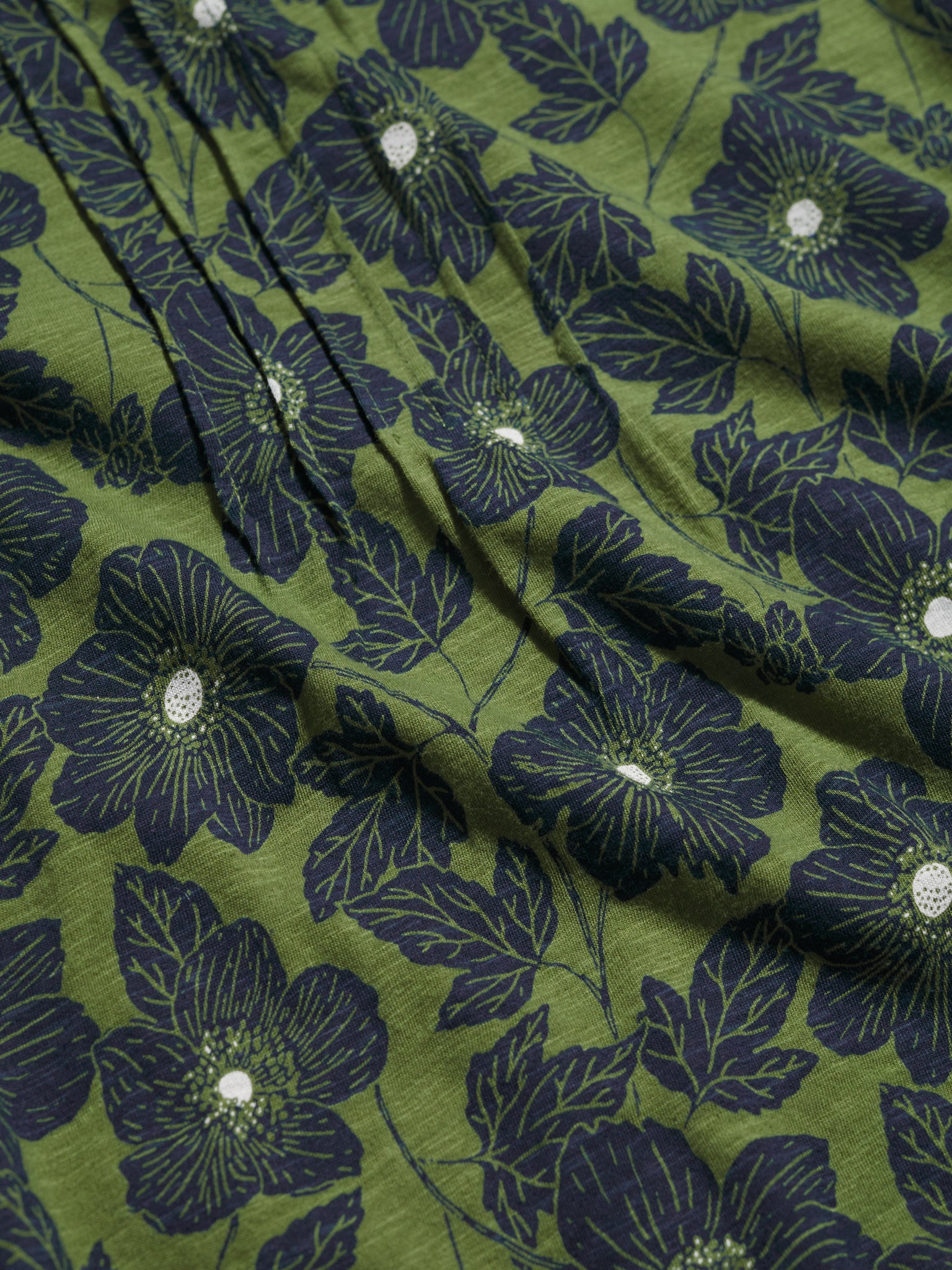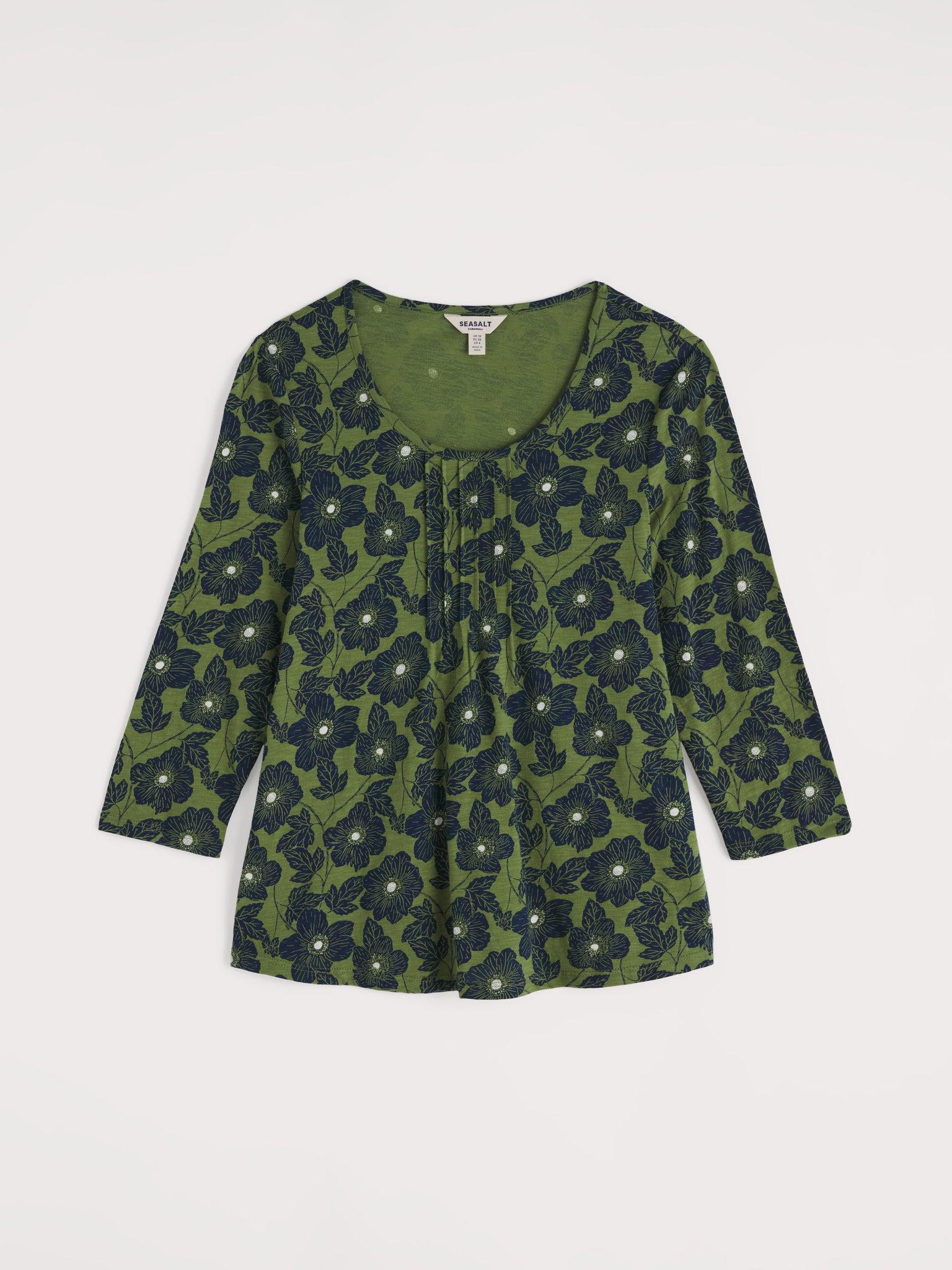 Seasalt's Penhollow is a pretty, printed top with slim 3/4 length sleeves and a feminine scoop neckline. Pintucks at the front combined with the organic cotton fabric give this top a lovely drape, while the green floral design looks great paired with dark denims through winter and white trousers when the weather warms up.