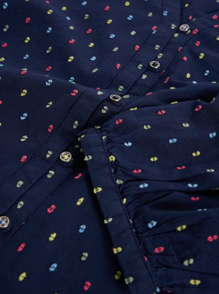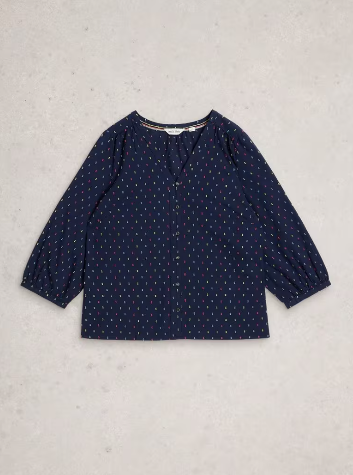 Meet Ruby, White Stuff's lovely button through top made from a breathable Organic Cotton. The V-neckline and voluminous 3/4 length sleeves come together to create a flattering and feminine shape, while the multicolour embroidered flecks through the fabric make for a pretty final touch.