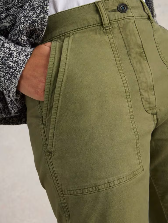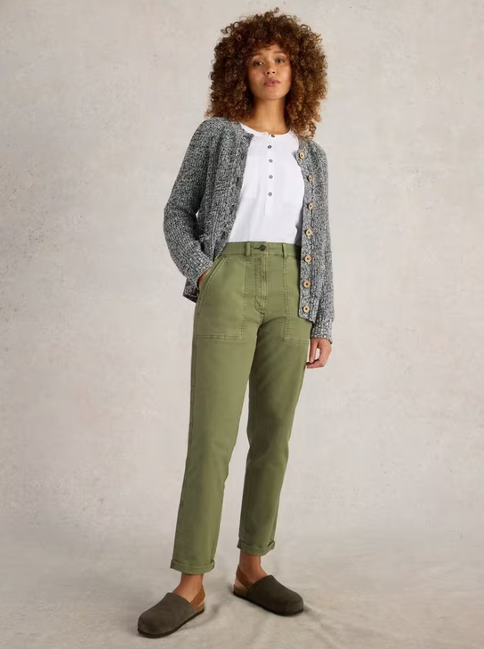 White Stuff's Twister Chino Trouser in Khaki Green come with a tapered leg and a relaxed fit. The super soft fabric with a touch of stretch makes them ideal for pottering about the house, whilst the smart shape means you can wear them to the office with a pretty blouse!