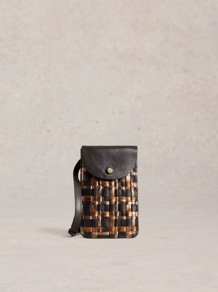 Introducing the White Stuff Coco Phone Bag with their new leather weave design in a metallic brown palette. Just the right size for your phone, keys, and loyalty cards (we won't ask how many). The adjustable crossbody strap and snap fastener means you can keep your essentials safe in style!