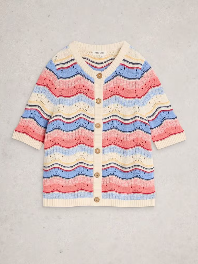 Add a little fun to your layers with White Stuff's Isabella Wavy Cardi! Beautiful spring colours combine with playful squiggly stripes in a cotton rich blend. This light knit will add a little warmth on breezy summer days, while the short sleeves keep you comfortably cool. Featuring a versatile button through design finished with stylish contrasting buttons.