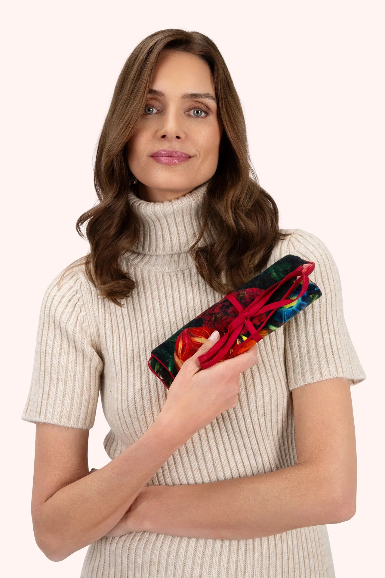 Powder's Jewellery Roll is the perfect gift for that jet-setting fashionista in your life, or makes a pretty little treat for yourself! Keep your sparkly bits organised in the zip compartments and ring holders, then roll up the luxurious velvet pouch so they stay protected during travel. The feminine Opulent Floral print in a rich Chocolate palette will make a lovely addition to your handbag or suitcase.